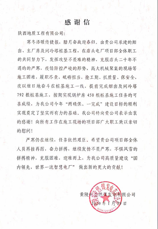 感謝信是對公司和店頭電廠項(xiàng)目部工作的肯定。在今后的工作中,公司將一如既往秉持“提質(zhì)增效、風(fēng)險(xiǎn)管控、優(yōu)質(zhì)服務(wù)”的經(jīng)營方針,充分發(fā)揚(yáng)地質(zhì)人“三光榮、四特別”精神,為地礦事業(yè)和譜寫陜西新時(shí)代追趕超越新篇章貢獻(xiàn)力量。