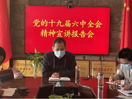 黨總支書記王強(qiáng)社按照《宣講提綱》,從六個(gè)方面為全體黨員宣講黨的十九屆六中全會(huì)精神,并闡釋了自己的見解。